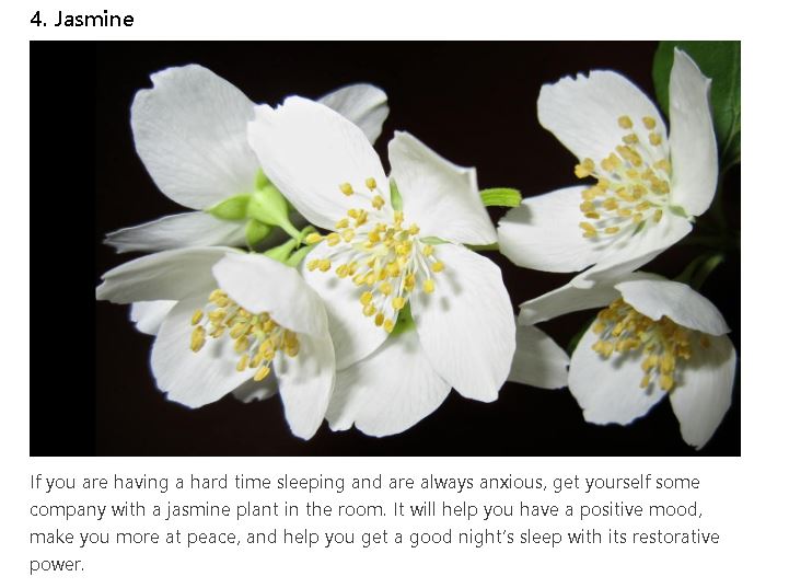 Jasmine: With delicate white petals, this flower’s sweet smell packs a surprising sleep punch. People who inhaled the scent while they slept experienced greater sleep efficiency, less movement during slumber, and overall better quality sleep. Surprisingly, its effects were even more powerful than those of lavender!